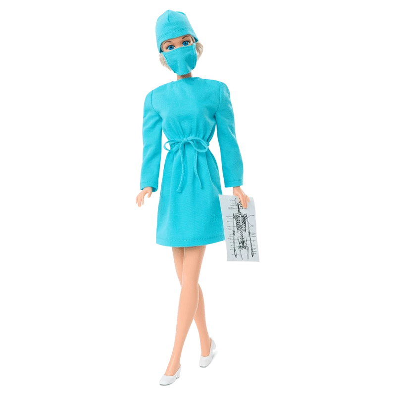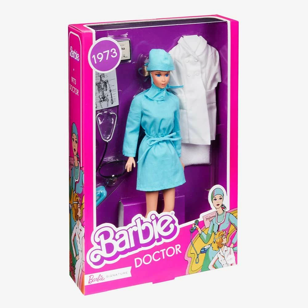 In 1973, Barbie® grabbed her diploma and broke the glass ceiling to become a doctor for the very first time. This classic Barbie® reproduction doll celebrates one of her most important careers while honoring the dedication of first responders everywhere.