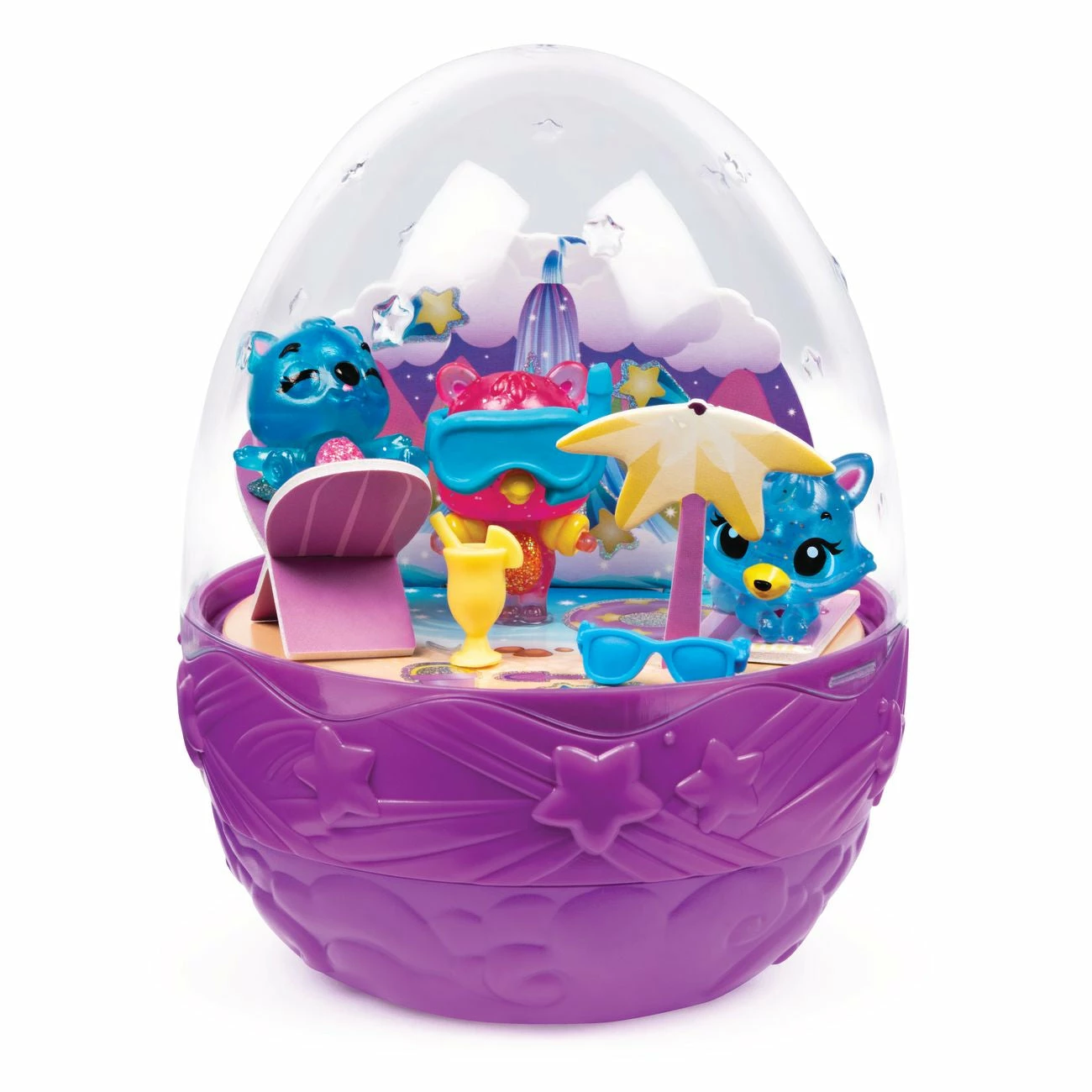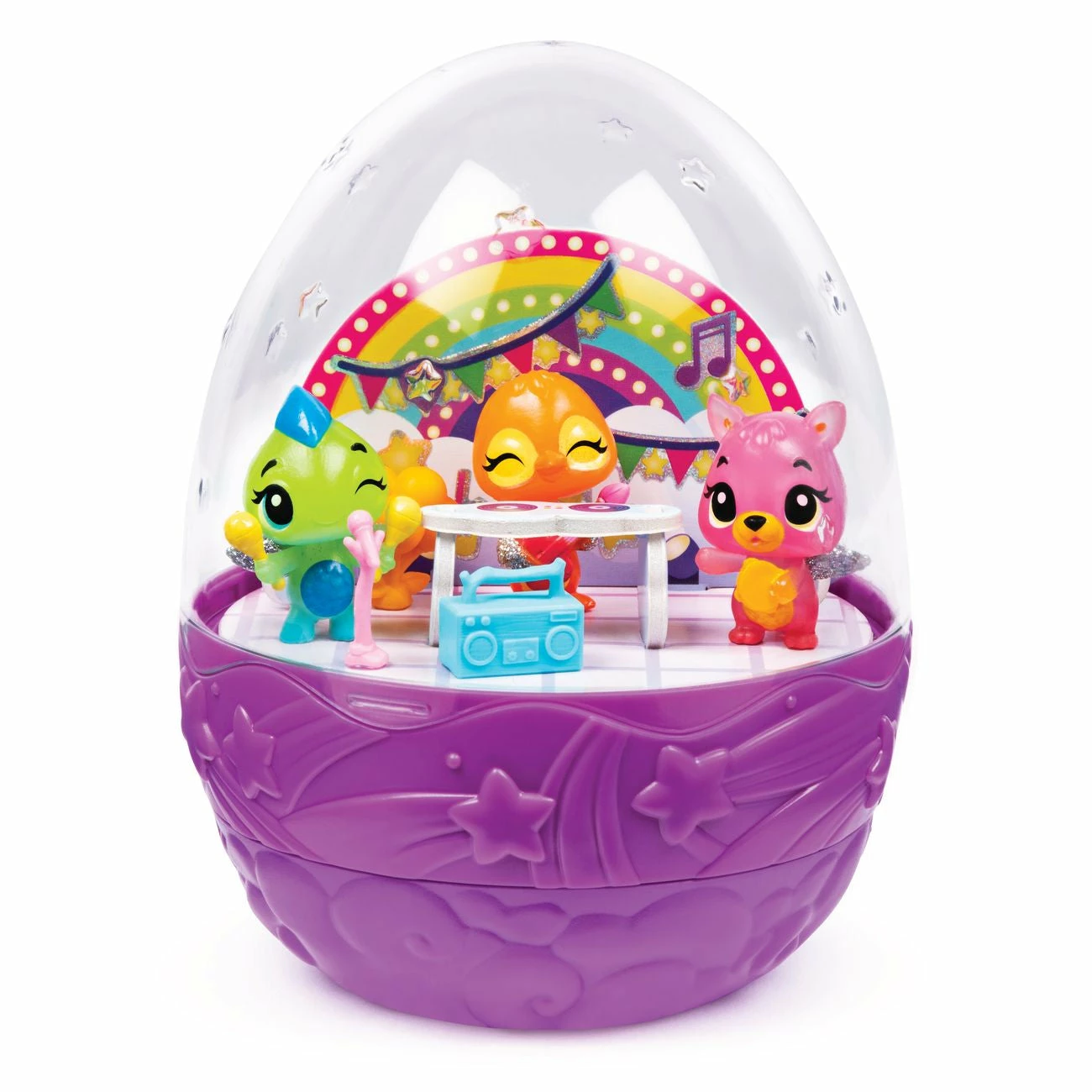 The ultimate unboxing experience from Hatchtopia is here! With the Hatchimals CollEGGtibles Secret Surprise Playset, you can unbox and build your own Hatchtopia scene. Jam-packed with fun surprises to discover and multiple layers of EGGcitement, you won’t know which Hatchtopia theme you’re unveiling until you start hatching. Get started by hatching the top layer to reveal three exclusive CollEGGtibles characters inside the three compartments! Next, twist to remove the top piece of the egg and find hidden papercraft decorations and stickers to help build out your scene! Finally, twist off the middle to uncover a final layer of surprises in the bottom of the egg – peel and reveal three unique accessories for your adorable new CollEGGtibles friends! Snap the pieces of the egg back together and decorate your scene. Set up the papercraft decorations and accessorize your CollEGGtibles to tell the story of your mini Hatchtopia scene! Play with your scene, and attach the clear egg lid back on top to display around your room. With so many Secret Surprise Playsets to choose from, which Secret Surprise will you hatch? Collect all of the Hatchimals CollEGGtibles Secret Surprise Playsets and uncover even more surprises!