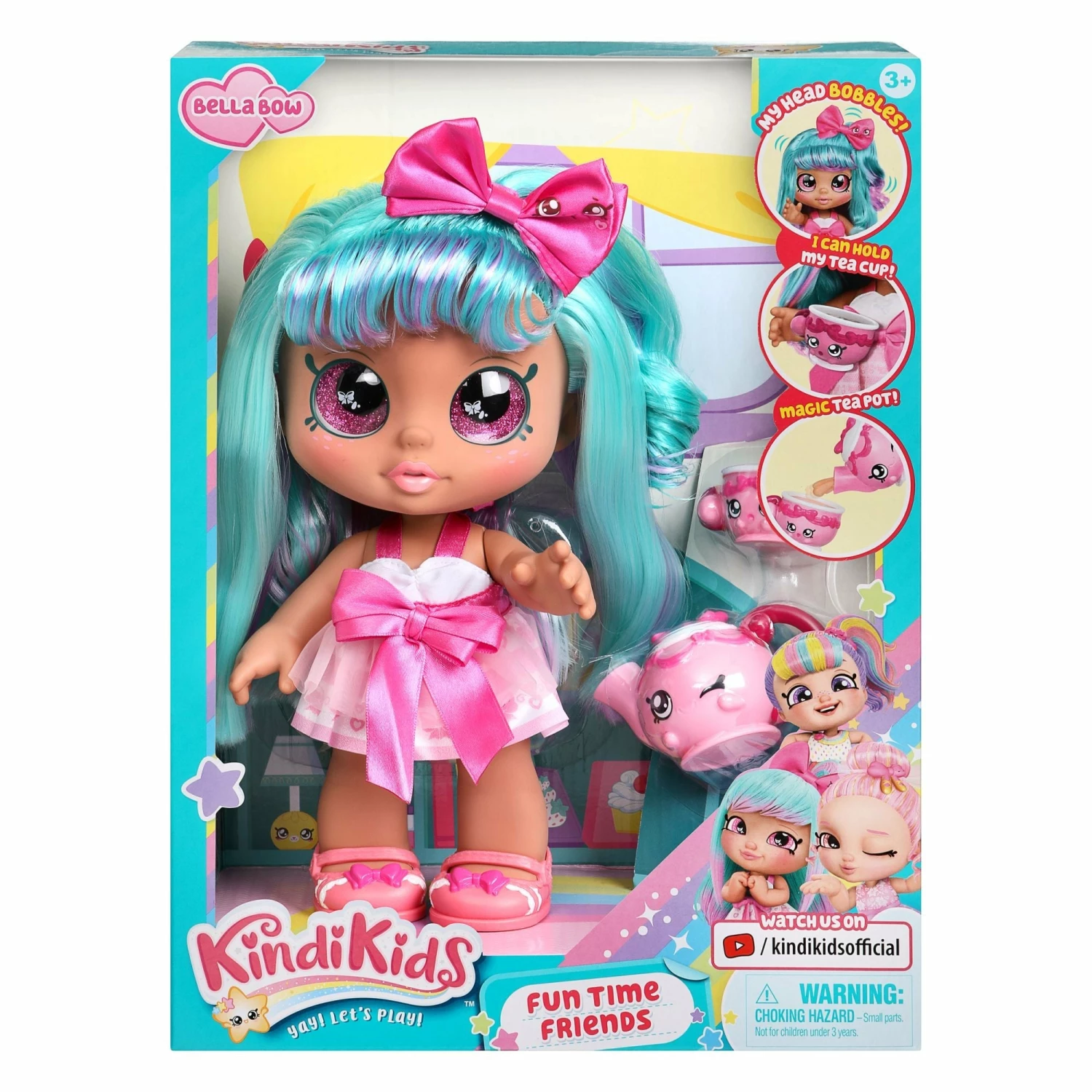 Kindi Kids “Fun Time Friends” are the cutest Pre-Schoolers around! These adorable little girls are full of fun and play and they love attending Rainbow Kinder – A place where every day is about playing together and making friends!From head to toe you’ll find a bow on this Kindi Kid! Bella Bow may be a little quiet, but it’s not because she’s tongue-tied, she just likes to listen! She’s all ears until something catches her eyes! (Which is most of the time!) Bella is a great host and love putting on tea parties with her Shopkins. They’re just “Bow Much Fun!” Dressed in the cutest Party Dress with a big pink satin bow, Bella Bow has bright blue hair with pink highlights that match her pink hair bow!Pick her up and see Bella Bow come to life! With big pink glittery eyes and adorable head that bobbles with every movement, she is all set to help you get ready for Kinder! Her sweet pink shoes are removeable along with her changeable clothes. Check out her two cute Shopkins with magical movement and action for lively fun – an adorable little pink tea cup that Bella can actually hold in her hand and a matching Shopkin Teapot! Tilt the Teapot and magically see the tea pour out! Girls will love collecting all the Kindi Kids toy dolls and accessories. Come and join Bella Bow and her other friends at the Rainbow Kinder, a world of imagination and discovery, where everything comes alive! They can’t wait to have a magical day with you!”