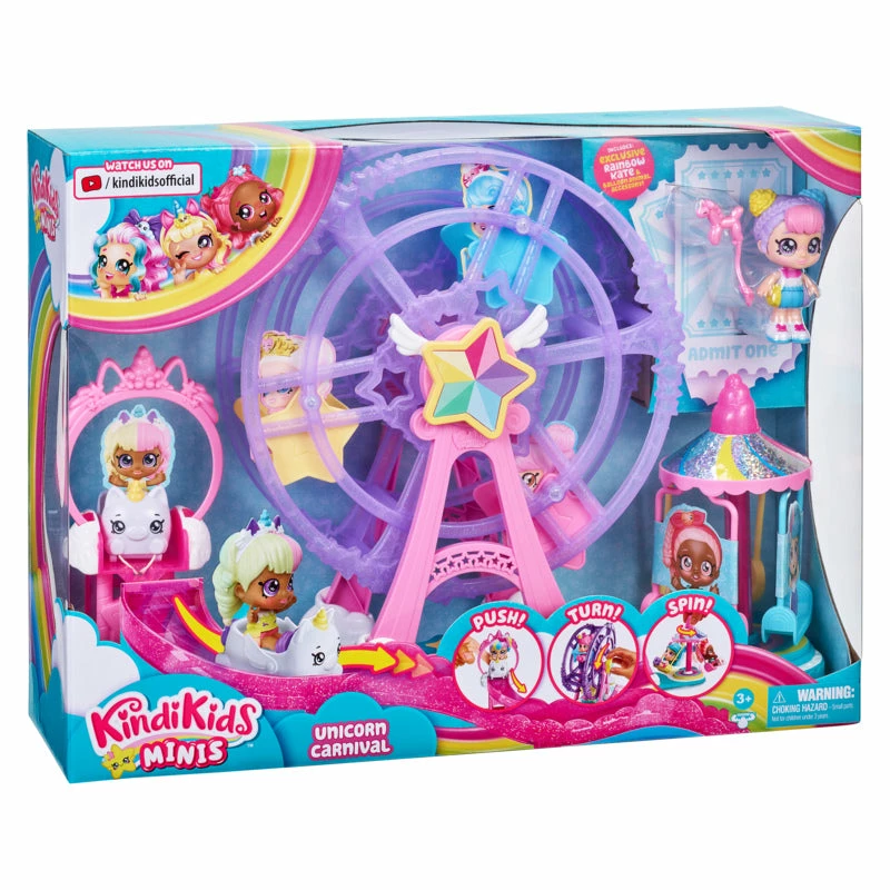 The Unicorn Carnival has come to town and Rainbow Kate is so excited to take her friends on all the Rainbow-tastic rides! The Kindi Kid Minis are in for the most Bobble-Fun day ever! Push the Unicorn Cart down the Rollercoaster! Turn the Big Star Ferris Wheel so Rainbow Kate and 2 of her mini friends can go for a ride. Then spin the Rainbow Swing to take these cute little girls for a twirl!