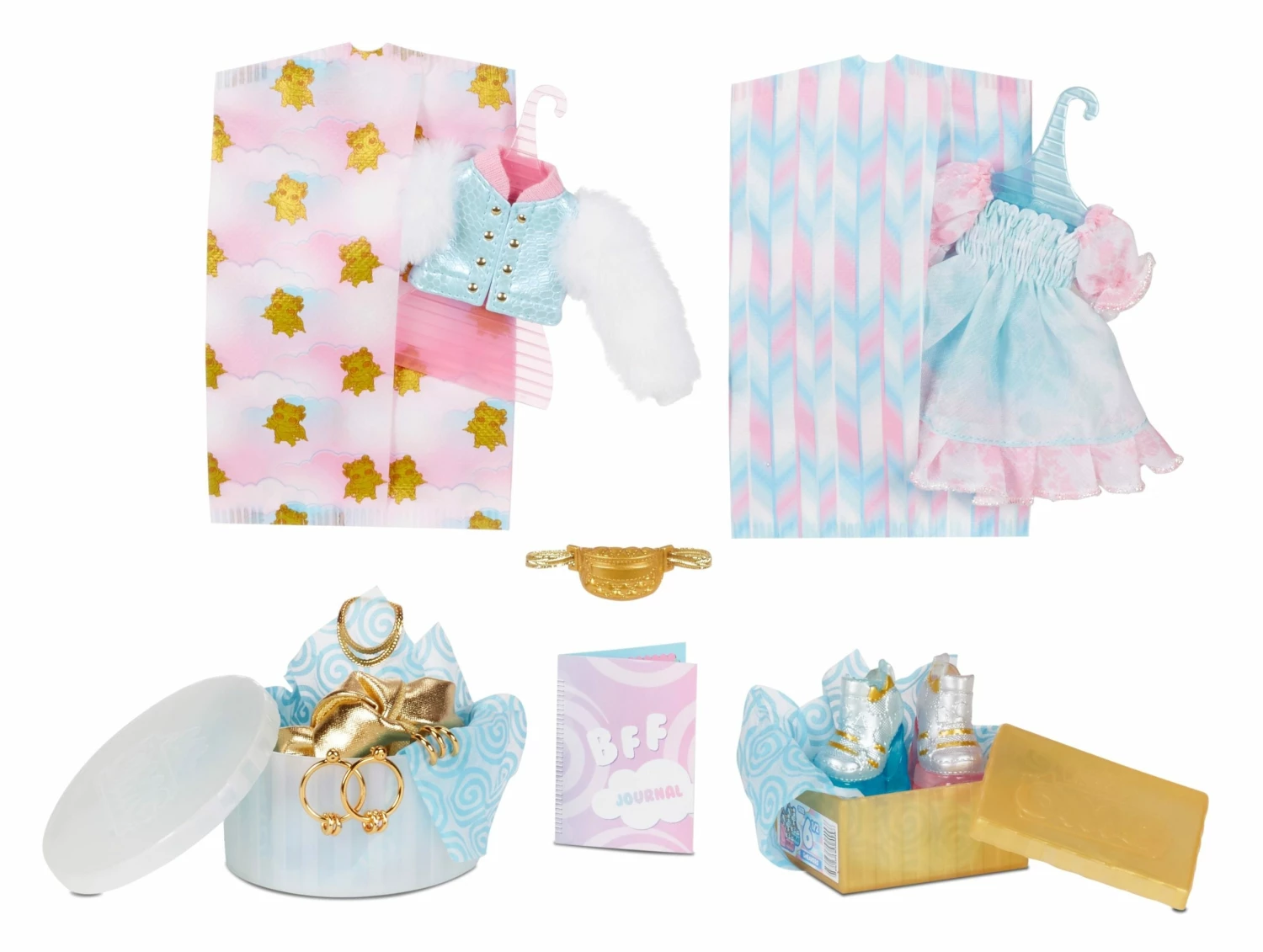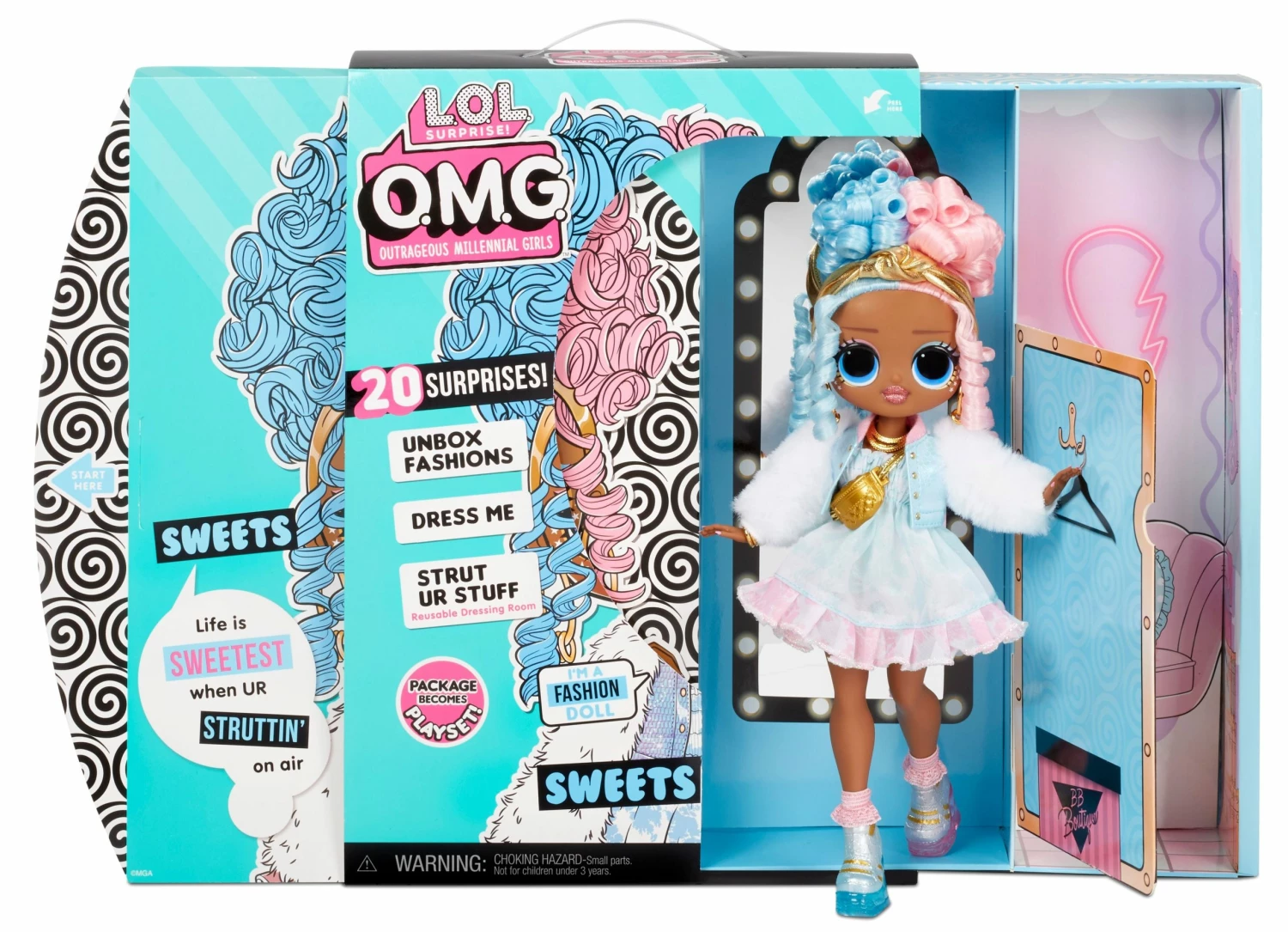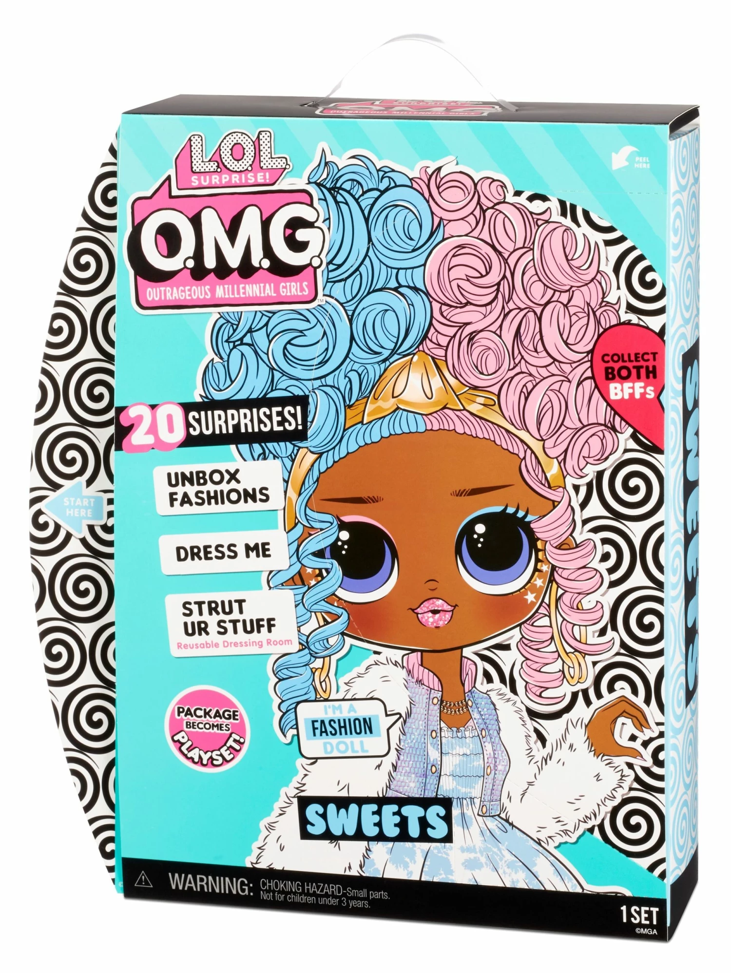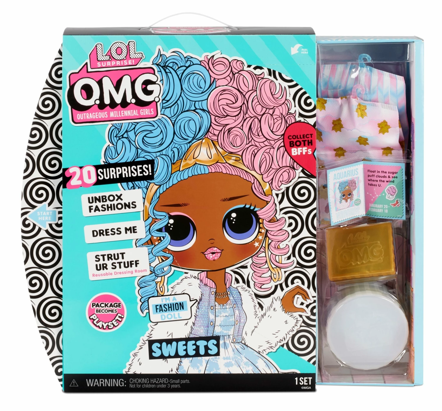 Life is sweetest when UR struttin’ on air! Unbox LOL Surprise OMG Series 4 fashion doll Sweets with 20 surprises. Sweets has stunning features, beautiful hair and her own fabulous style. Plus, she’s the big sister to fan favorite LOL Surprise character, Sugar! Opposites R Sweet! LOL Surprise OMG Series 4 is opposite themed. Each package comes with a removable piece that is half of a heart. Collect both Sweets and Spicy Babe to complete the heart! The package also becomes a reusable play space for Sweets to strut her stuff and show off her personality. Unbox Sweet’s fabulous garment bag to reveal a fashion and open her hat box to find her accessories. Have her strike a pose to show off her included doll stand. Includes a fashion doll, outfit, shoes, accessories, hat box, hair brush, garment bag, sticker, hanger, doll stand and reusable package play space. With Sweets, float in the sugar puff clouds & see where the wind takes U!