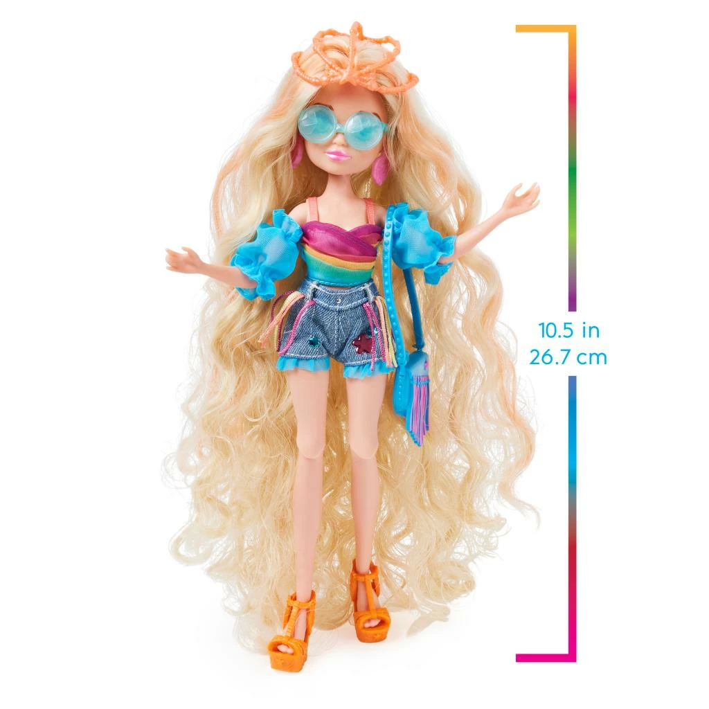Meet Finly: the group’s boho girl. This 10.5-inch toy fashion doll features a fabulous removable mermaid tail with colorful scales, charms, and fringe; a rainbow boho top, flowing hair with orange highlights and six doll accessories, including a sea-inspired headpiece, a purse with fringe and surprise accessory hidden in the seashell. Drop the shell into a bowl of warm water and watch as it magically pops open, revealing an accessory to add to Finly’s look!