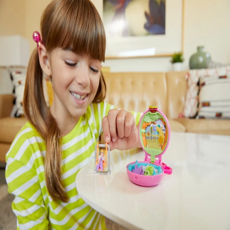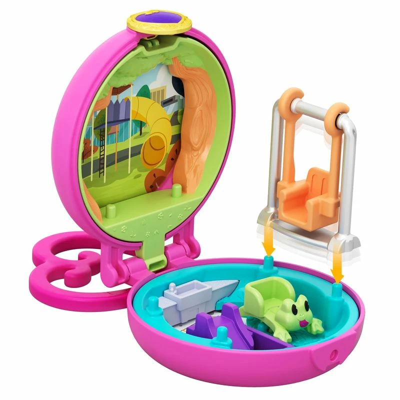 ?Tiny Pocket Places compacts open to reveal a fun theme and come with a micro doll, a large removable accessory (you can place it inside or outside of the compact). fun reveals and a sticker sheet. Kids can pop open the top frame of the compact to insert a personal photo or scene for added play value! With Polly Stick technology, micro Polly doll can stick anywhere on the bottom label of the compact. Compact also has a cute heart-shaped ring attached so kids can clip it on backpacks or purses and take it on the go for great Polly Pocket adventures, anytime, anywhere! Colours and decorations may vary. For ages 4 and up.? Features: ?It’s time for fun with Polly Pocket Tiny Compacts! ? ?Each compact opens to reveal a fun theme and comes with a micro doll and large removable accessory that goes inside or outside of the compact.? ?Compacts also include fun activity reveals and a sticker sheet.? ?Pop open the top frame and insert a personal photo or a scene for more play value!? ?Polly Stick technology lets kids stick a micro doll anywhere on the bottom label of the compact.? ?Cute heart-shaped ring on each compact lets kids clip them on backpacks or purses and take it on the go!?